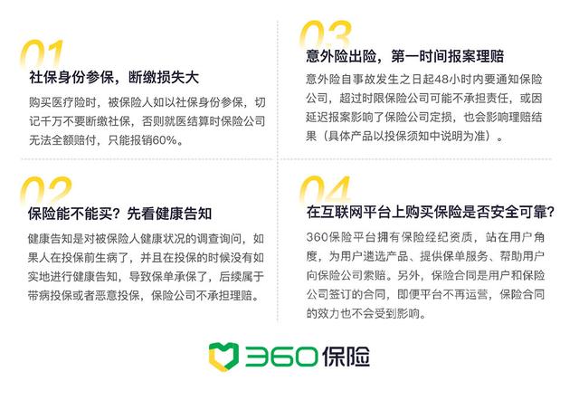 为避免更多人遭遇保险理赔道路上的“坑”,360保险也整理了一份避坑指南,让大家少走弯路。除了以社保身份参保注意不要断缴社保外,投保前仔细阅读健康告知也十分重要。投保人未如实进行健康告知,导致保单承保了,后续属于带病投保或者恶意投保。若不幸发生意外事故,要第一时间通知保险公司,若过时限或因延迟报案影响了保险公司定损,以免影响理赔结果。