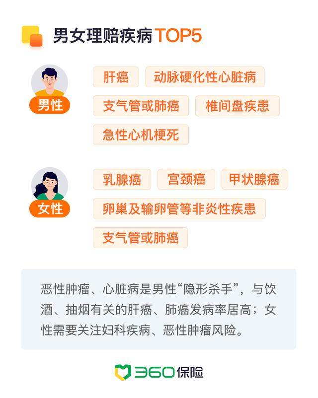 理赔疾病数据显示,男性高发疾病的前五类是肝癌、动脉硬化性心脏病、支气管或肺癌、椎间盘疾患、急性心肌梗死,这几类疾病多由不良生活作息、饮食习惯以及压力过大等原因引起。女性的高发疾病则为乳腺癌、宫颈癌、支气管或肺癌、甲状腺癌、卵巢及输卵管等非炎性疾患,妇科疾病值得加强关注与及早筛查。对于80、90后人群而言,乳腺癌、肝癌、甲状腺癌是赔付次数最多的三种疾病,成为当代年轻人“杀手”。