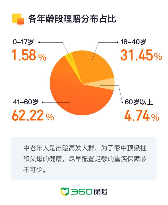 从赔付类型来看,360保险医疗险赔付占比76.5%,件均赔付金额约为6700元。重疾险占比21%,出险用户以41-60岁年龄段及恶性肿瘤人群为主。意外险个人累计最高赔付金额为51万元,摔伤骨折、扭伤是意外险出险常见原因。