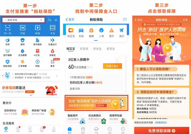 今天开始,医护人员在支付宝App内搜索“蚂蚁保险”,进入页面就能认领保障,家属、同事代领功能也在加紧开发中。如果后续需申请保障金,可在支付宝内完成。