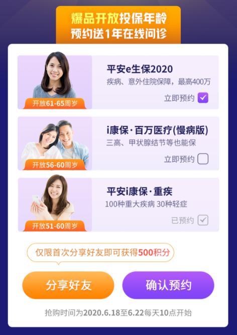 活动产品:平安e生保plus、平安e生保(保证续保版)、平安e家保2018、平安抗癌卫士(2018版)、平安e生保(2017版)、平安i康保·老年医疗、平安i康保·重疾、i康保·老年医疗(升级版)、i康保·少儿配齐。